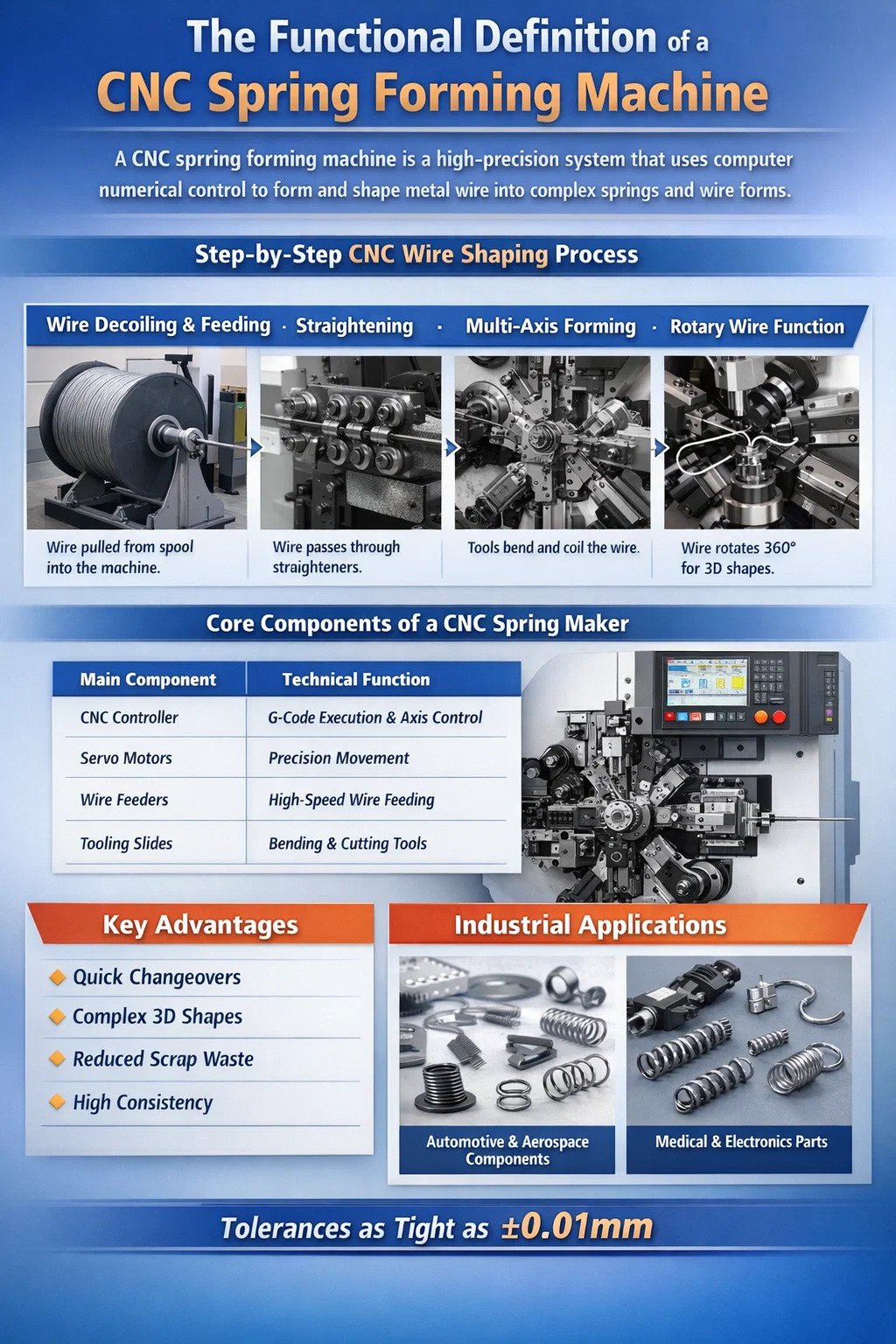 A CNC-Federformmaschine ist ein hochpräzises Fertigungssystem, das computergestützte numerische Steuerung nutzt, um das Biegen, Aufwickeln und Formen von Metalldraht in komplexe Federgeometrien und komplizierte Drahtformen zu automatisieren. Im Gegensatz zu herkömmlichen mechanischen Federmachern, die auf festen Nockenwellen basieren, verwendet diese moderne Ausrüstung mehrere unabhängige Servomotoren um verschiedene Achsen zu steuern und so nicht standardmäßige Formen zu erstellen, die manuell nicht zu erreichen wären.