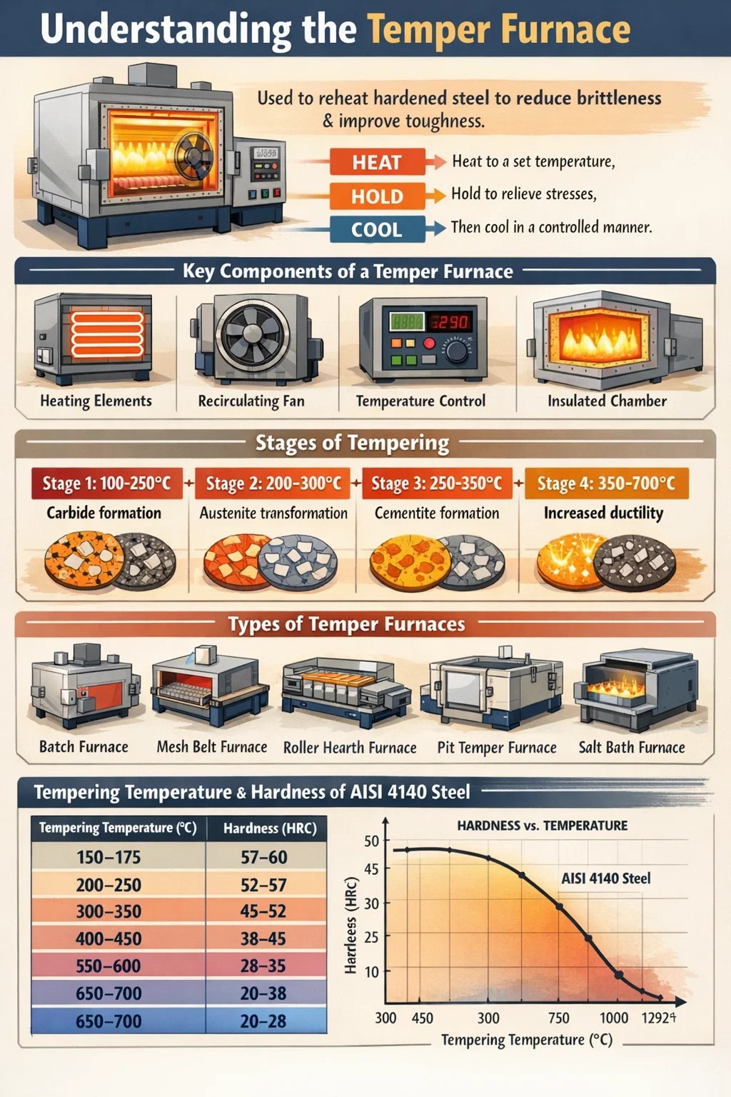Im Klartext: Nach dem Härten wird Stahl extrem hart, aber auch gefährlich spröde. Ein Temperofen ist das Werkzeug, das dieses Ungleichgewicht korrigiert. Es verwandelt ein sprödes, spannungsbelastetes Teil in ein Bauteil mit einer sorgfältig abgestimmten Kombination aus Härte und Duktilität – geeignet für reale mechanische Belastungen.