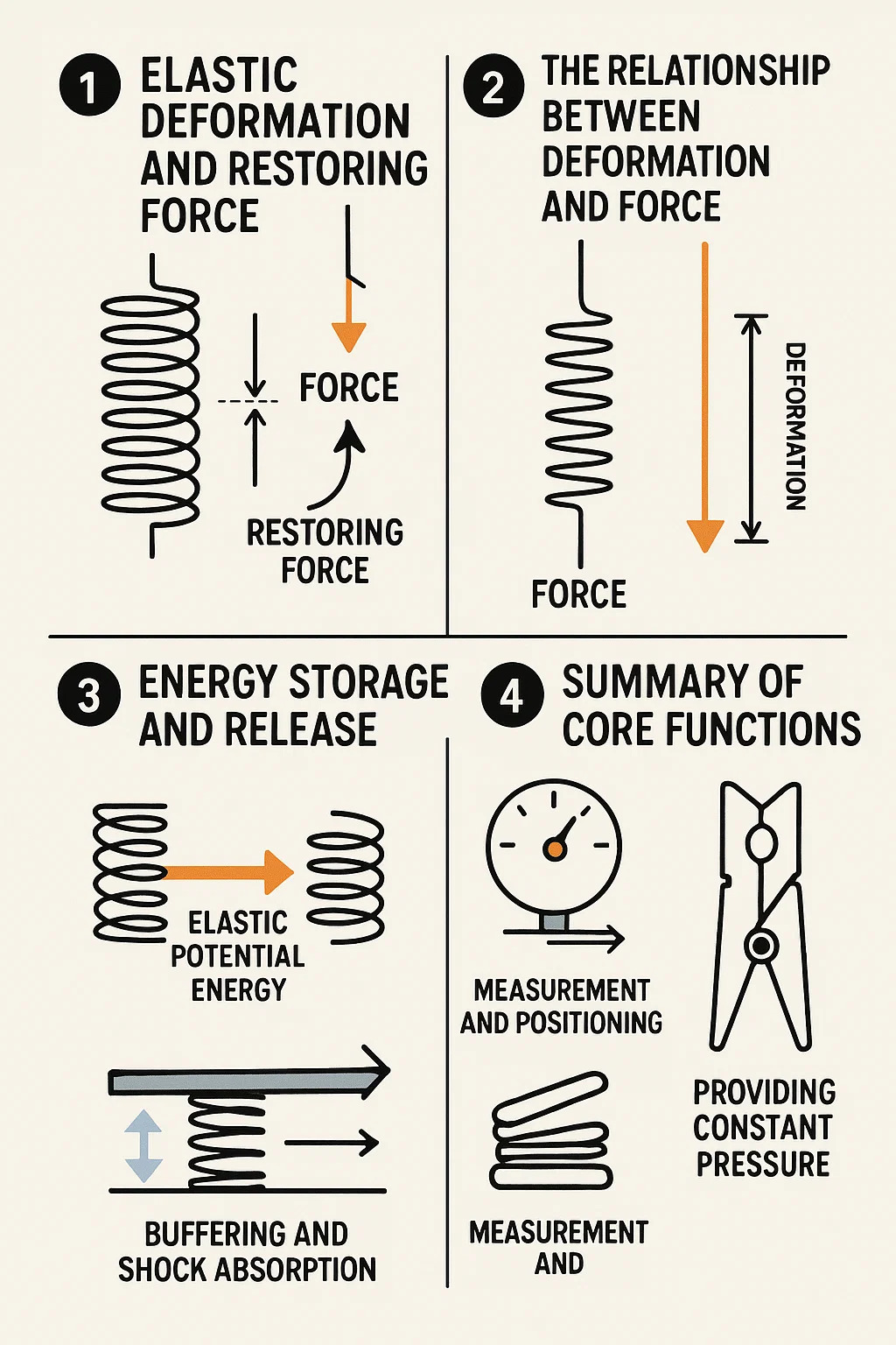 Inhärente „Zurückhaltung“: Diese Verformung ist nicht dauerhaft. Das Material der Feder erzeugt eine Kraft, die der Verformung Widerstand leistet, die wir Rückstellkraft oder elastische Kraft nennen. Die Richtung dieser Kraft ist immer entgegengesetzt zur Richtung der äußeren Kraft, die die Verformung verursacht.